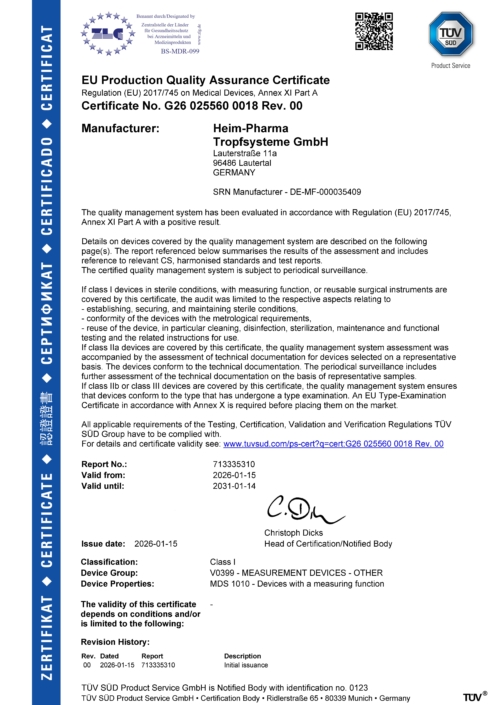 Un grand nombre de certificats attestent que nos partenaires et clients peuvent absolument compter sur nous pour la qualité et la pureté de leurs systèmes de dosage et de compte-gouttes. En tant que leader de l’innovation, nous travaillons constamment à des solutions qui vont au-delà des normes exigées.